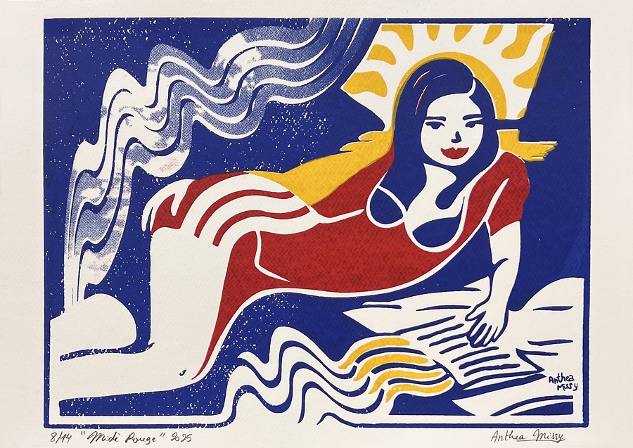 “Midi Rouge” captures a sun-washed moment—warmth held softly between light and daydream. Through its vivid reds, profound blues, and luminous golds, the piece radiates a quiet sensuality and the intimate glow of midday.